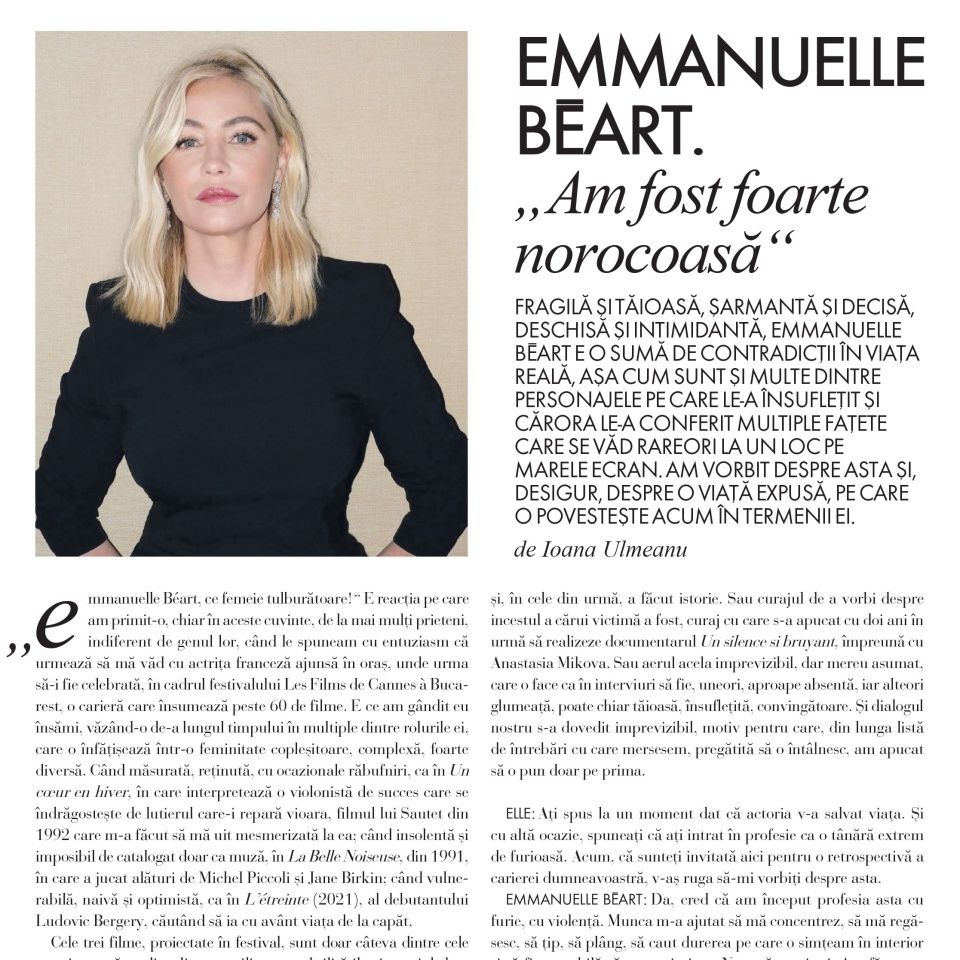 ELLE INTERVIU: Emmanuelle Béart: ”Am fost foarte norocoasă”. Fragilă și tăioasă, șarmantă și decisă, deschisă și intimidantă, actrița franceză este o sumă de contradicții în viața reală, așa cum sunt și multe dintre personajele pe care le-a însuflețit și cărora le-a conferit multiple fațete care se văd rareori la un loc pe marele ecran. Ioana Ulmeanu a vorbit cu ea despre acest lucru, dar și despre o viață expusă privirilor altora, pe care Béart o povestește acum în termenii ei.